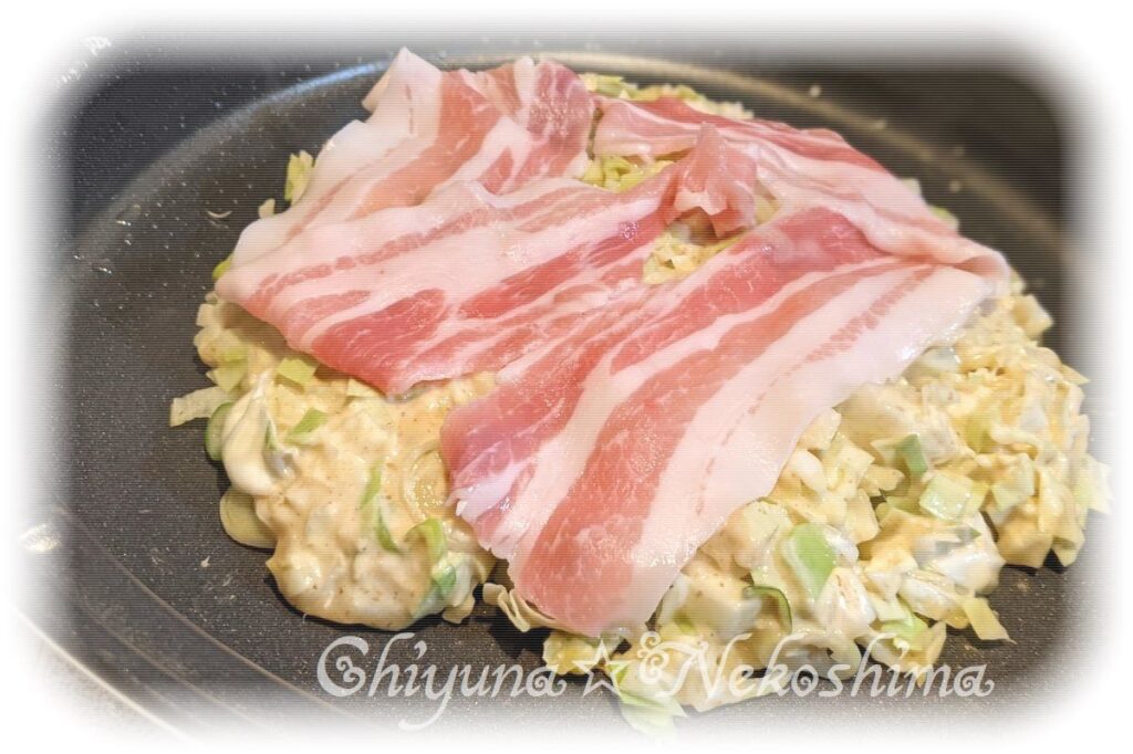 ⑥ ふちが白っぽく乾いてきたら、上に豚肉を乗せてヘラで裏返し、弱火にしてよく火を通す。