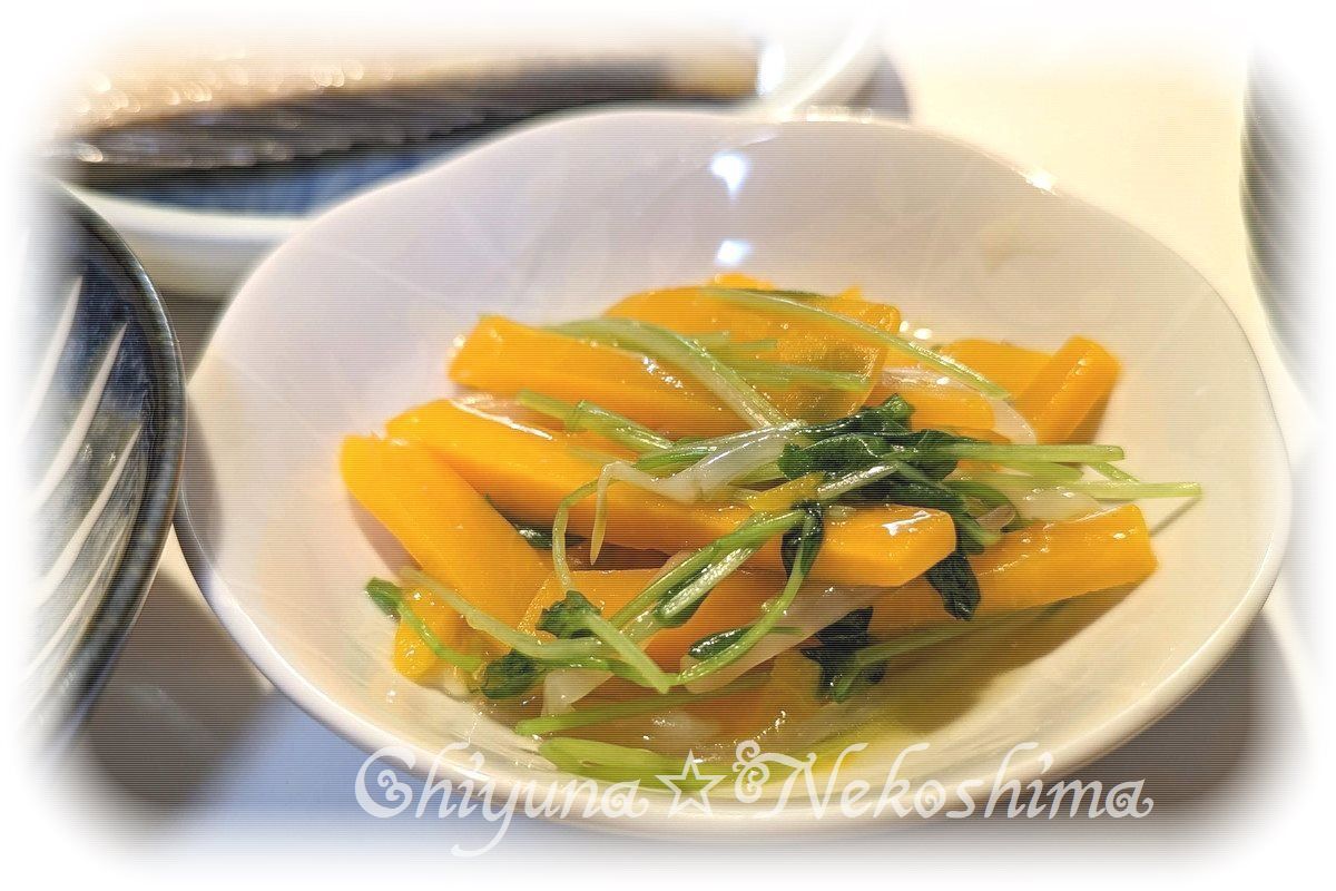 ① コリンキーは5mm幅の薄切りにする。もやしは下茹でする。豆苗は5cm長さに切る。