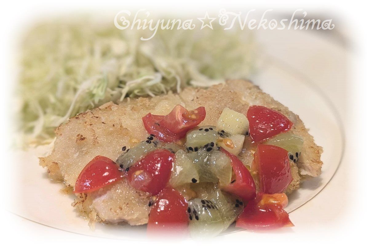 ① キウイは皮を剥き1cm角、ミニトマトは8等分にして、オリーブオイル 大4、レモン汁 小1、はちみつ 大1/2、塩 小1/2と混ぜ合わせる。