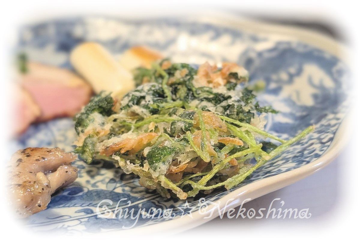 ② ボウルに衣を作り、①の三つ葉、さくらえびを加えて軽く混ぜ合わせる。