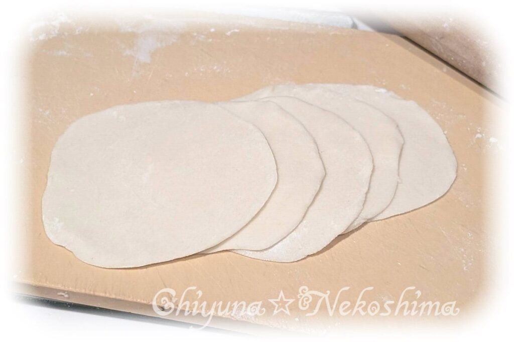 ⑤ 皮同士がくっつかないように、強力粉をまぶしておく。